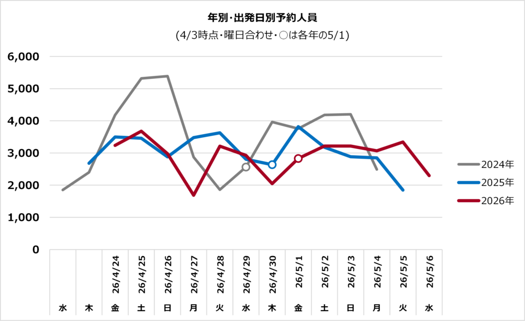 〇日並びの影響により、5月5日(火)・6日(水)の予約数が前年同期比180%超。4月27日(月)~5月1日(金)が「分散旅行」の狙い目に