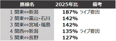 〇路線別では、関東⇔新潟(前年同期比187%)、関東⇔宮城・福島(同142%)、関東⇔富山・石川(同142%)などの中距離路線が好調