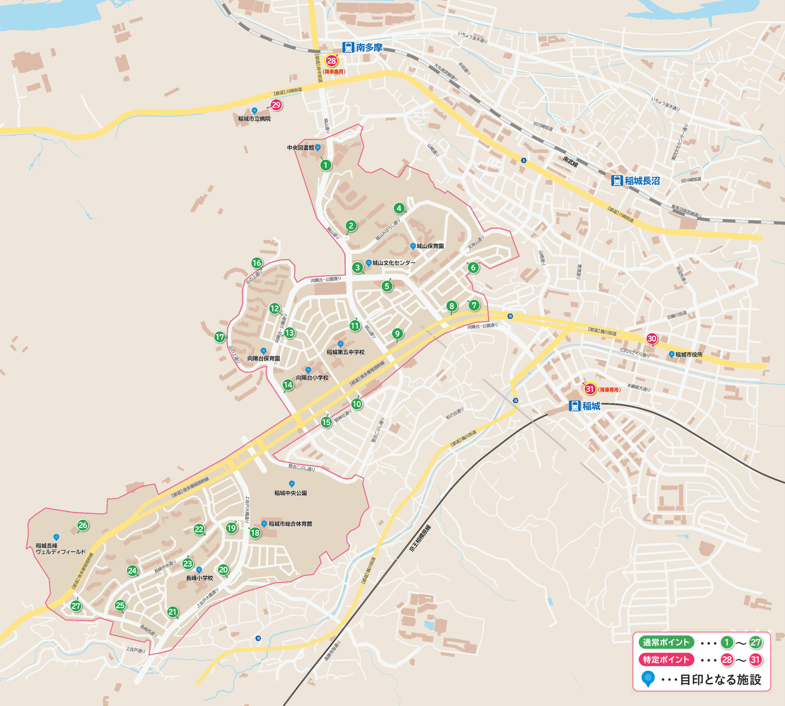 ※特定ポイントは、「南多摩駅南口前(降車専用)」「稲城市立病院」「稲城市役所」「稲城駅北口(降車専用)」の4箇所です。特定ポイント間の移動はできません。「南多摩駅南口前(降車専用)」、「稲城駅北口(降車専用)」は降車専用となり乗車できません。
