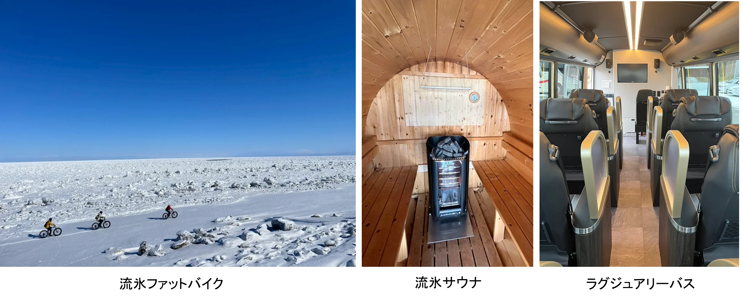 「流氷カヤック」や「流氷ファットバイク」、「流氷サウナ」といったこの時期にしか体験できない複数のアクティビティを日帰りで体験いただけます。またツアーの最後には、一流料理人による北海道産の食材をふんだんに使用した「流氷特別ディナー」を食べながら、史上初(※)となる「流氷ライトアップ」(予定)をご覧いただけます。“五感”をフル活用して流氷を体験できる「ここでしか味わえない唯一無二の体験」を創出します。