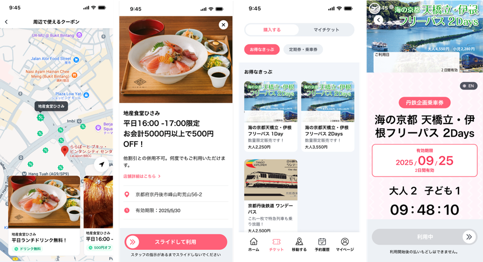 移動が便利になる周遊きっぷと観光コンテンツのクーポンやアクティビティ予約導線を「mobiアプリ」上で提供することで、利用者の観光周遊を促進します。例えば、丹後海陸交通株式会社の協力を受け期間限定で天橋立傘松公園、観光船などが利用できる「傘松観光券 2,000円券」が半額になるクーポン券を提供します。また、アクティビティの予約に関しては一般社団法人 京都府北部地域連携都市圏振興社(通称:海の京都DMO)と連携し提供します。デジタルチケット機能は原券への引き換えが不要で、「mobiアプリ」内で周遊に便利な鉄道・バスの企画切符を購入、利用までできる機能となります。この機能により、「mobiアプリ」一つで移動から観光まで体験できるようになり観光周遊の促進を目指します。