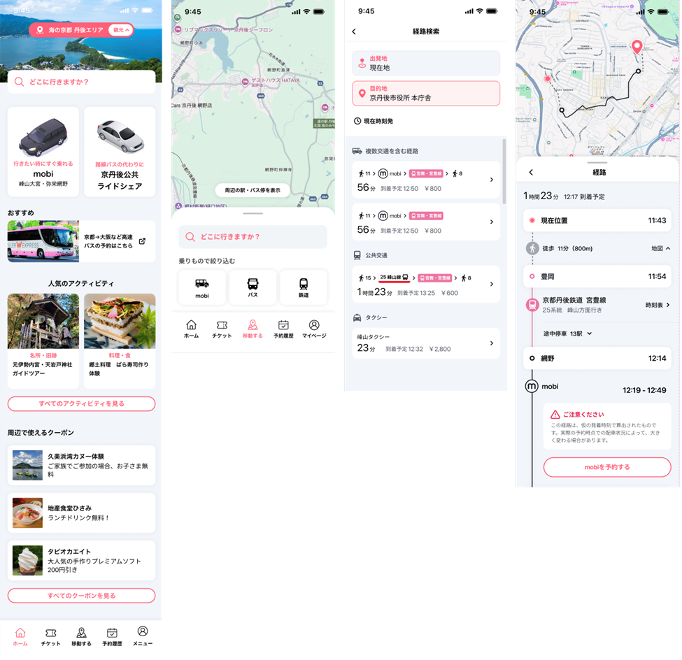 「mobiアプリ」では、鉄道やバスに加え、タクシーやAIオンデマンド交通「mobi」、公共ライドシェア、自家用有償運送など、地域特有のすべての輸送資源を横断的に経路検索できるようになります。また、別のWEB予約サービスにて運用している「京丹後市公共ライドシェア」も「mobiアプリ」を通じて利用できるようになり、利用者がワンストップで交通サービスを利用でき、乗り換え時の待ち時間短縮も実現します。